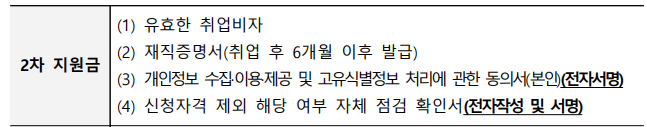 2차 지원금은 근로 개시 6개월 이후부터 8개월 시점까지 신청 가능하며, 1차 지원금을 수령한 사람이 동일 업체에서 6개월 간 계속 근로한 경우에만 신청할 수 있어요.