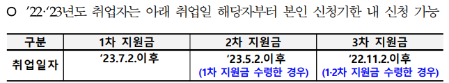 만약 1차와 2차 지원금을 수령 후 이직한 경우, 최초 취업 기업에서 근로 개시 12개월 이후부터 14개월 시점까지 신청할 수 있어요.