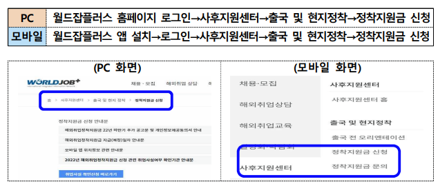 PC나 모바일을 통해 월드잡 플러스 홈페이지 또는 앱에 로그인하여 정착지원금을 신청할 수 있어요.