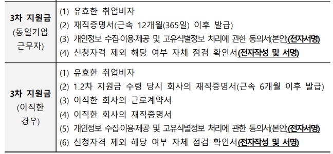 3차 지원금은 근로 개시 12개월(365일) 이후부터 14개월 시점까지 신청 가능해요. 단, 12개월 이상 근로하고 취업 비자 유효 기간이 만료되지 않은 경우에만 신청할 수 있어요.
