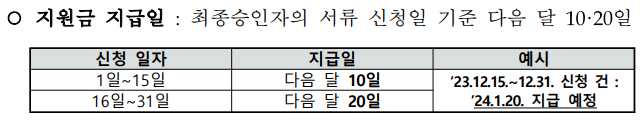 지원금은 최종 승인자의 서류 신청일 기준으로 다음 달 10일 또는 20일에 지급되는데요. 예를 들어, 12월 15일부터 31일 사이에 신청한 경우에는 다음 달 20일에 지급될 예정이에요.