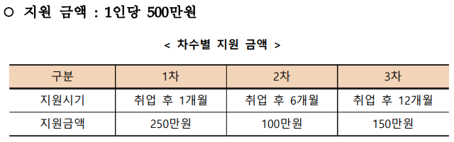 1차 250만원, 2차 100만원, 3차 150만원을 합쳐 총 500만원을 지원받을 수 있으며, 3차까지 지원받으려면 근로 개시 후 14개월이 지나야 모두 지원받을 수 있습니다.
