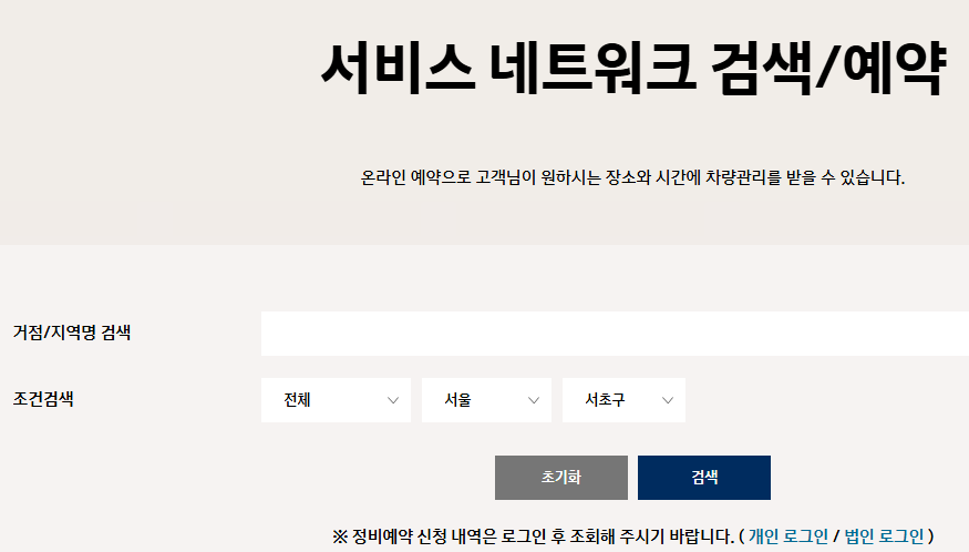 차량 정보 입력 후 정비 항목과 센터를 선택하는 방식입니다.