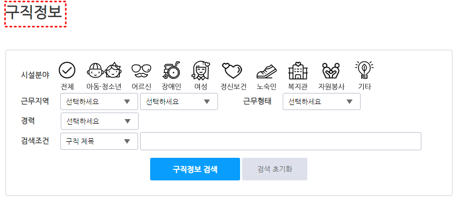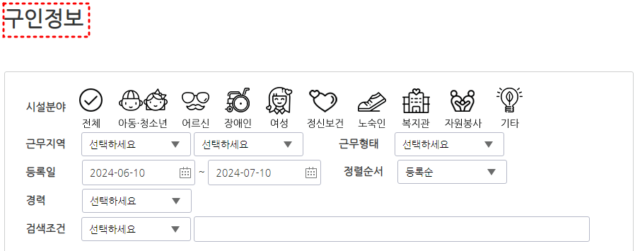 아동, 청소년, 어르신, 장애인, 여성 등 시설분야와 근무지역, 근무형태, 경력 등으로 필터링 하면 본인이 원하는 구인 구직 정보를 빠르게 확인할 수 있습니다.