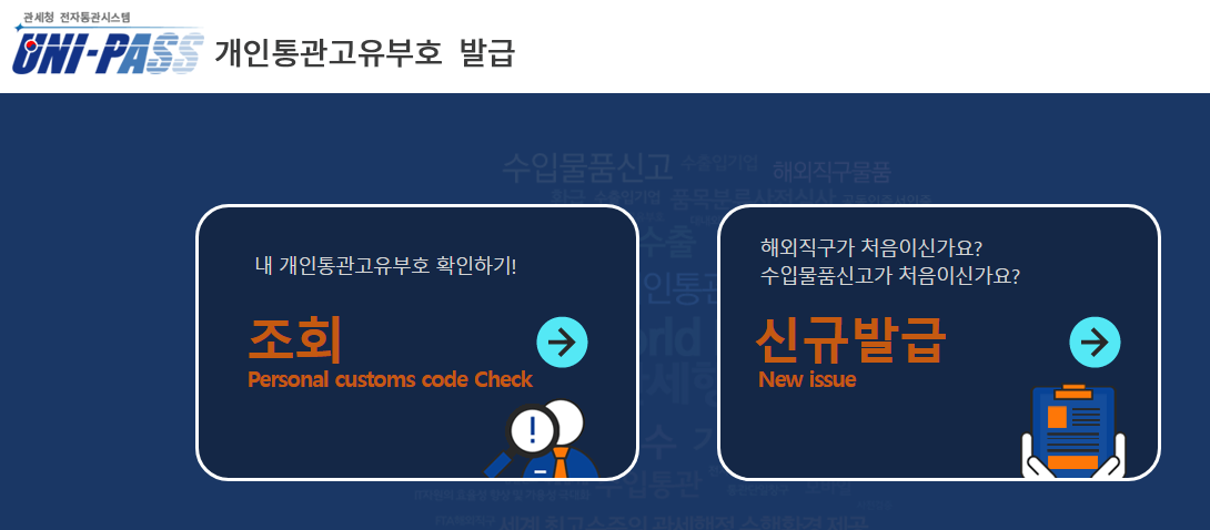 개인통관고유부호의 신규발급 또한 조회와 마찬가지로 본인인증과 함께 관세청 유니패스 사이트에서 진행할 수 있습니다.