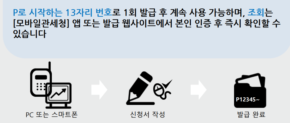 개인통관고유부호의 조회 및 발급은 PC를 통해서도 가능하고, 관세청 어플을 설치하여 모바일로도 신청과 즉시 발급이 가능합니다.