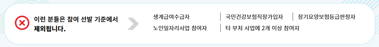 정부 또는 지자체에서 제공하는 다른 일자리 사업에 이미 참여하고 있는 경우, 노인일자리 사업에 중복으로 참여할 수 없어요. 두 개 이상의 일자리 사업에 참여하고 있는 분들은 제외 대상이에요.