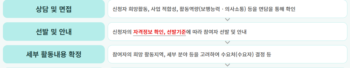 이 면담을 통해 신청자의 자격과 선발 기준을 확인하게 되며, 이후에 희망하는 활동 지역, 세부 분야 등을 고려하여 최종 결정이 이루어집니다.