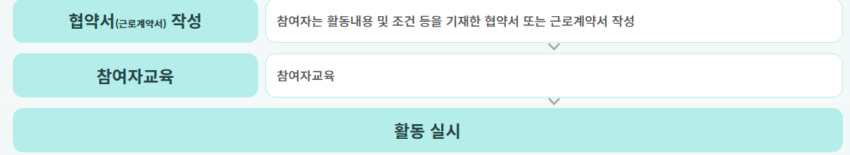 선발이 확정되면 협약서와 근로계약서를 작성하게 되고, 이후 필요한 교육과정을 받게 됩니다.