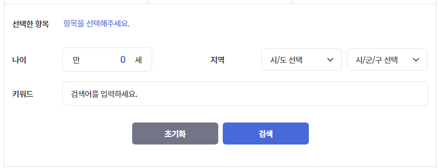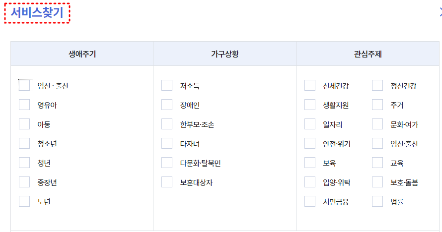 아동, 청소년, 노년 등의 생애주기 기준과 저소득, 장애인, 다자녀 등의 가구 상황 등을 선택할 수 있고, 나이와 사는 지역, 키워드를 기준으로도 검색할 수 있습니다.
