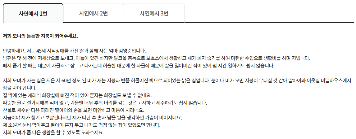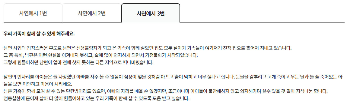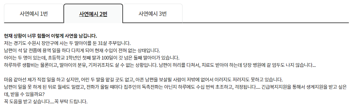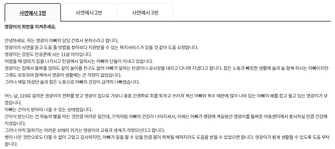 또한, 작성된 사연이 최대한 정확하고 구체적일수록 담당자가 상황을 더 잘 파악할 수 있어요. 이를 통해 더 적절한 지원이 이루어질 가능성이 높아져요.