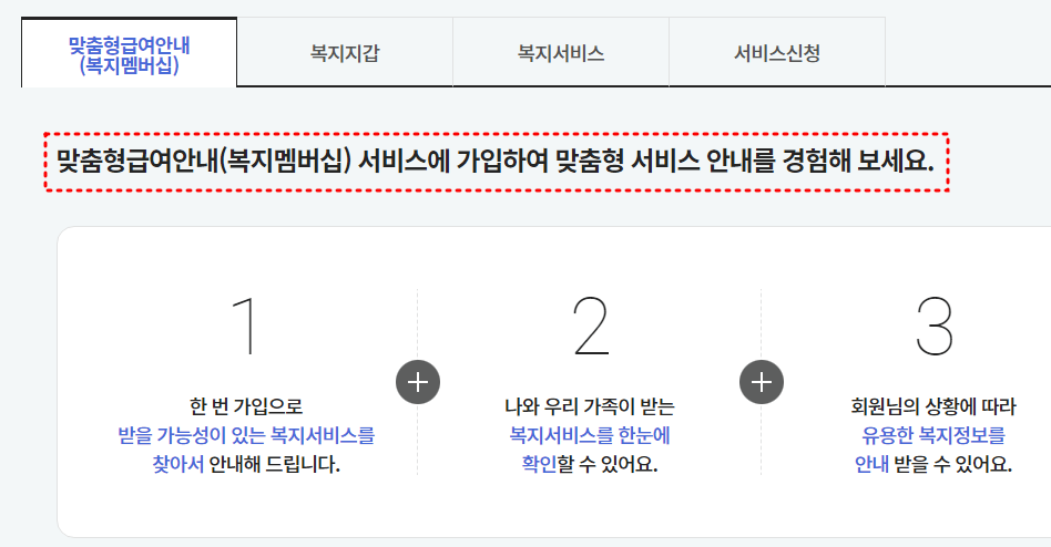 복지로 홈페이지에서 회원가입을 통해서 로그인을 하게 되면 맞춤형 복지 서비스인 복지멤버십을 통해 본인에 맞는 복지정보를 확인할 수 있습니다.