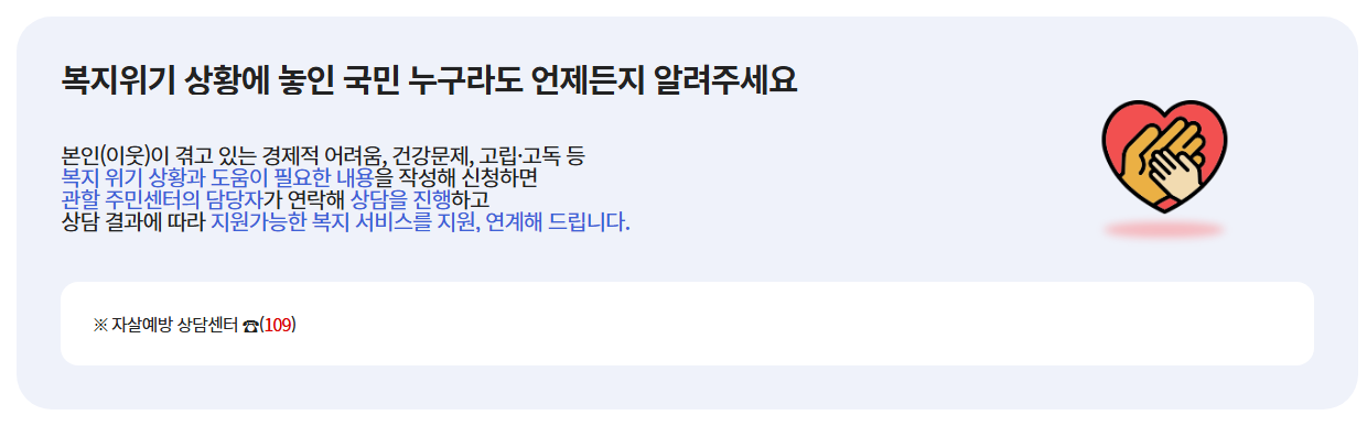 또한, 주민센터나 보건복지 상담센터(☎129)를 통해서도 직접 도움을 요청할 수 있어요. 이처럼 다양한 채널을 통해 도움 요청이 가능하니, 가장 편리한 방법을 선택하면 좋을 것 같아요.
