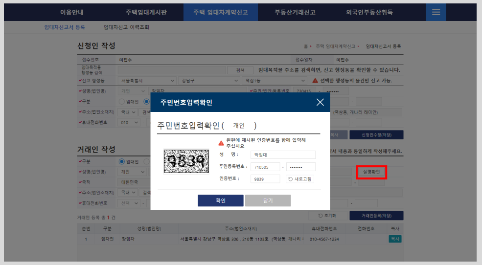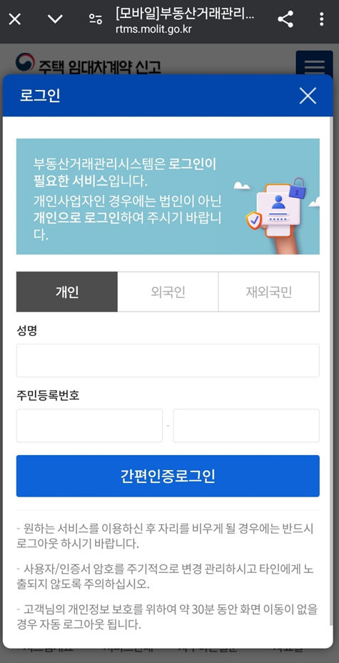 시범 운용 때 주택임대차계약 신고를 이용하려면 국토부에서 운용하는 부동산거래관리시스템 사이트에 접속하여 간편인증을 통해서 간단히 진행할 수 있습니다.
