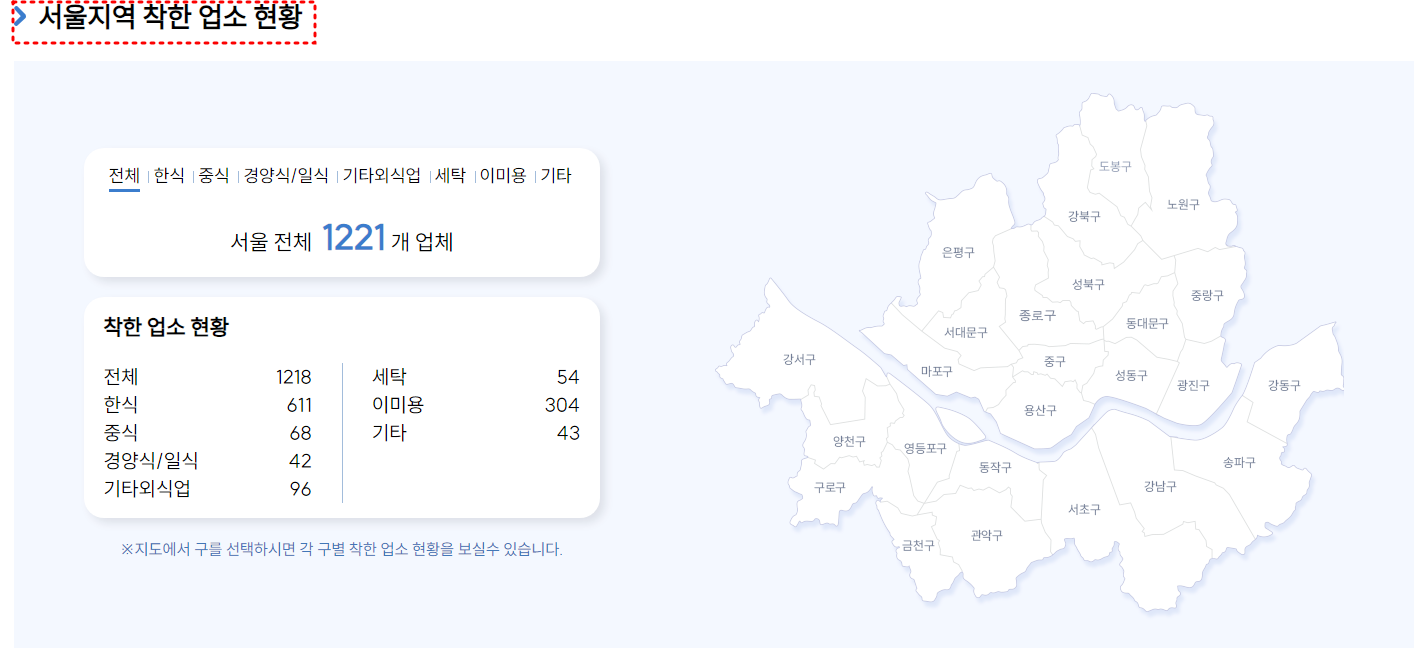 서울시에서 제공하는 착한가격업소 홈페이지에서는 착한가격업소가 내가 원하는 지역에서 어디에 위치하는지 쉽게 찾아볼 수 있으니 직접 홈페이지에 접속해서 찾아보는 것이 좋습니다.