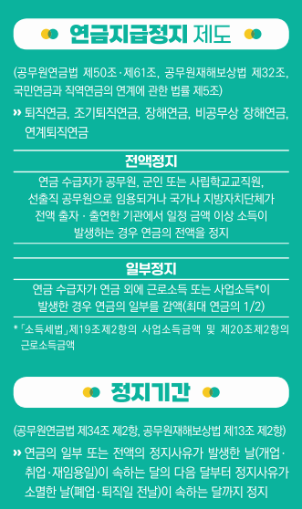 다시 말하면 공무원으로 재취업하거나, 특정 금액 이상의 소득이 발생하면 연금 지급이 정지될 수 있는 거죠.