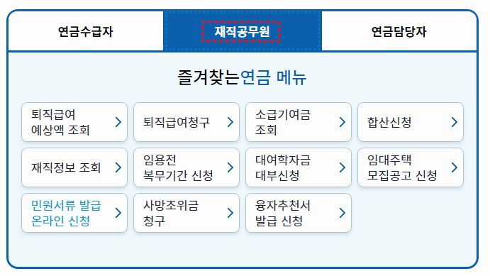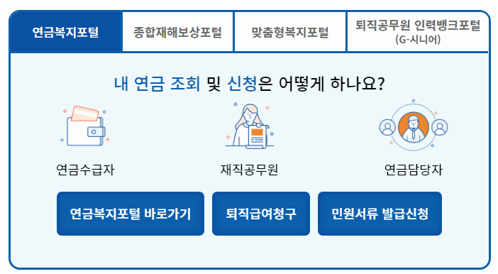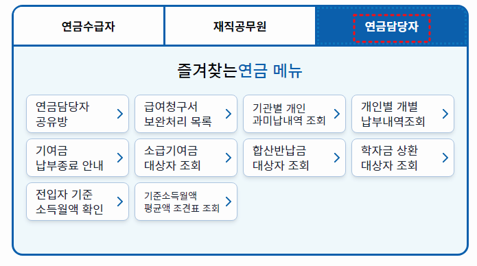 연금수급자나 재직공무원, 연금담당자가 사용하는 메뉴들이 각기 다르니, 한 번쯤 접속하시어 원하시는 메뉴를 선택하여 조회해보는 것도 좋을 것 같습니다.