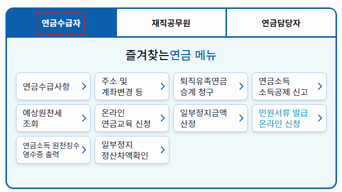 예를 들어, 연급수급자의 경우 연금수급사항, 연금소득 소득공제 신고, 연금소득 원천징수 영수증 출력, 민원서류 발급 온라인 신청 등 다양한 메뉴를 이용할 수 있습니다.