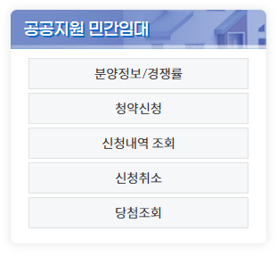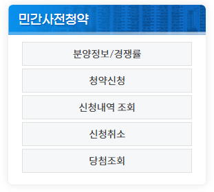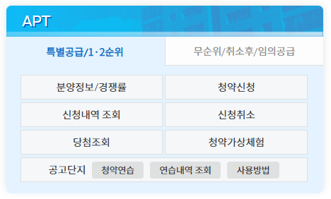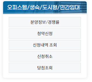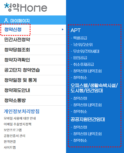 청약을 신청하기 위해서는 청약홈 사이트에 접속해서, 좌측의 청약신청 메뉴에서 본인이 원하는 정보를 조회 및 신청, 취소하실 수 있습니다.