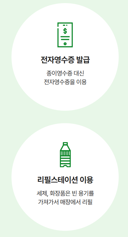 전자영수증은 건당 100원, 다회용컵 이용은 개당 300원, 리필스테이션은 1회 2천원까지 적립돼요.