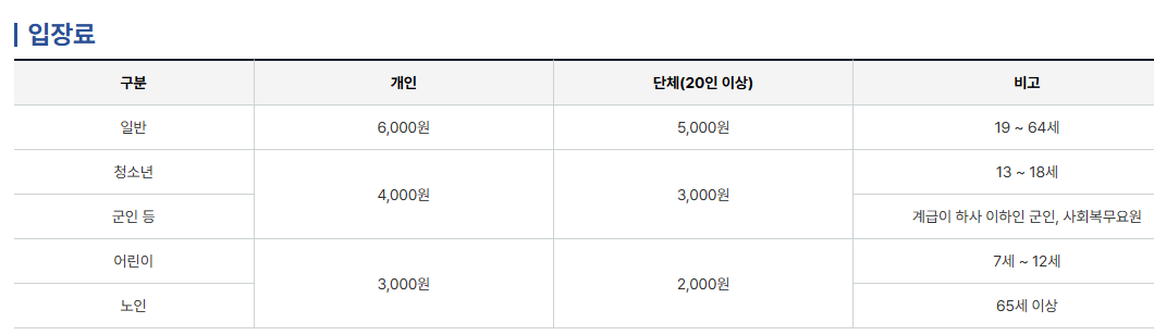 또한 국가유공자, 장애인, 임신부, 군인, 6세 이하 유아 등은 무료로 입장할 수 있어요.