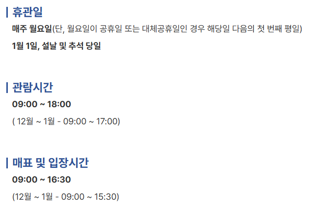 매주 월요일, 1월 1일, 설날과 추석 당일은 휴관합니다. 단, 성수기에는 월요일도 정상 개관합니다.