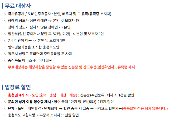 국가유공자, 장애인, 임신부, 군인, 6세 이하 유아 등은 무료입니다. 단, 증빙서류를 반드시 제시해야 합니다.