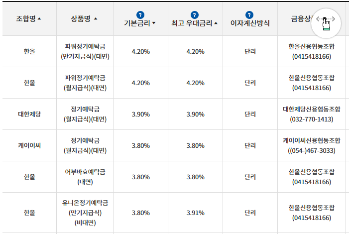 이곳에서는 조합별 정기예금 기본금리와 우대금리를 한눈에 볼 수 있습니다.