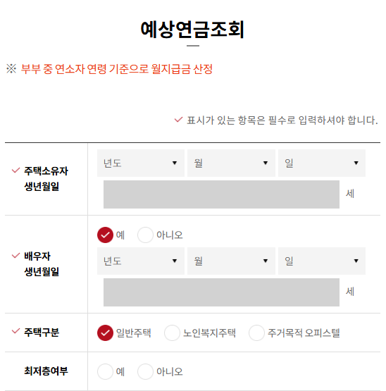 가입자의 나이와 주택 가격을 입력하면 예상 수령액을 바로 확인할 수 있습니다.